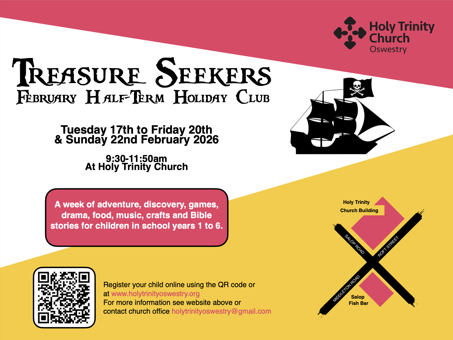 We'll be meeting each day at 9.30am-11.50am on Pirate Island (the Holy Trinity Church building).